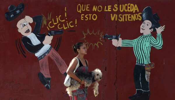 A woman carries her dog past an armory shop in San Pedro Sula, Honduras, March 11, 2012.Esteban Felix/AP Photo