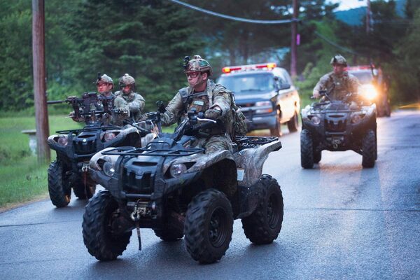 Law enforcement personnel search a wooded area after they received a tip that convicted murderers Richard Matt and David Sweat were in the area on June 24, 2015 in Mountain View, New York.Scott Olson/Getty Images
