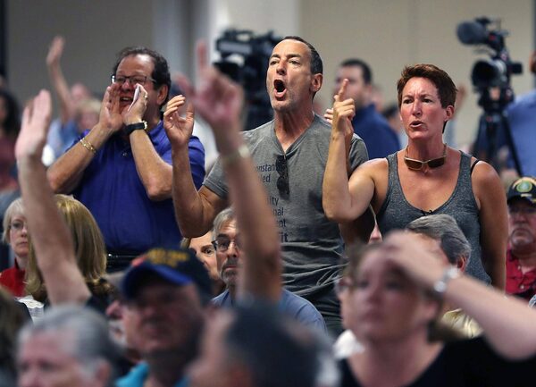 A crowd reacts during a town hall meeting at the Havert L. Fenn Center in Fort Pierce, Fla., on Friday.Joe Raedle/Getty Images