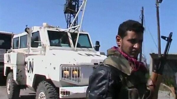 A video circulated by the Syrian Observatory for Human Rights, a London-based opposition group, showed Abu Qaed al-Faleh, acting as a spokesman for the rebel group, dressed in army fatigues and standing in front of two white armoured UN vehicles in which several people were sitting wearing the familiar light-blue UN helmets and body armour.