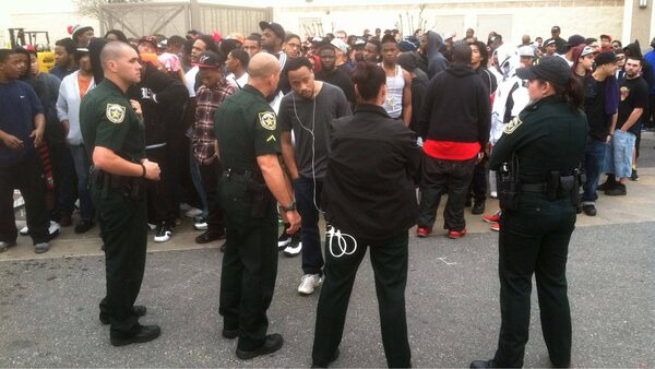 Orange County Sheriff's deputies move the crowd back after an announcement Friday morning, Feb. 24, 2012 that a shoe giveaway was cancelled at the Foot Locker at Florida Mall, in Orlando, Fla.Joe Burbank/AP
