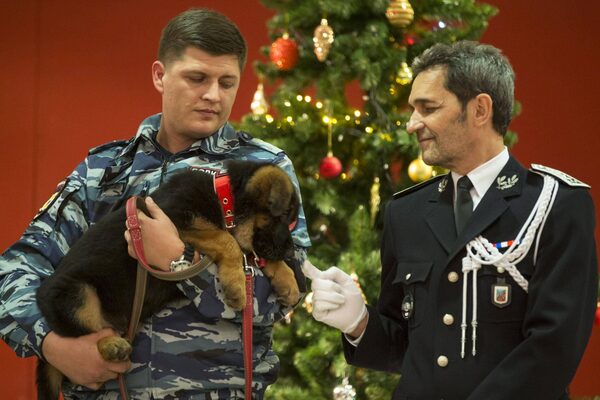 A Russian police officer shows a puppy, named Dobrynya, to a French police before presenting it in the French Embassy in Moscow on Monday, Dec. 7.Pavel Golovkin/The Associated Press