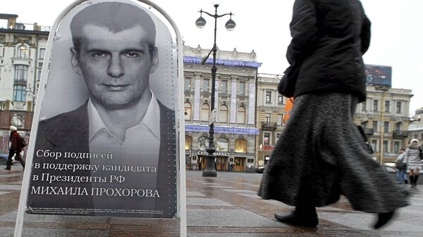 A woman in St. Petersburg passes a board Jan. 11 displaying a portrait of Russian billionaire Mikhail Prokhorov, appealing for his supporters' signatures. Two million are needed for the registration of a presidential candidate,