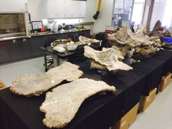 Bones of Dreadnoughtus schrani are seen in Professor Kenneth Lacovara's fossil lab at Drexel University in Philadelphia, Pennsylvania in this undated photo released on September 3, 2014.Reuters
