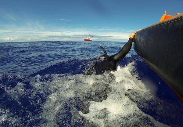 A fast response craft from Australian Defence Vessel Ocean Shield tows Able Seaman Clearance Diver Michael Arnold as he searches the ocean for debris of the missing Malaysia Airlines Flight MH 370.LEUT Ryan Davis