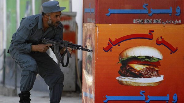 An armed Afghan police officer takes his position after gunmen launched multiple attacks in the Afghan capital Kabul April 15, 2012.Omar Sobhani/Reuters