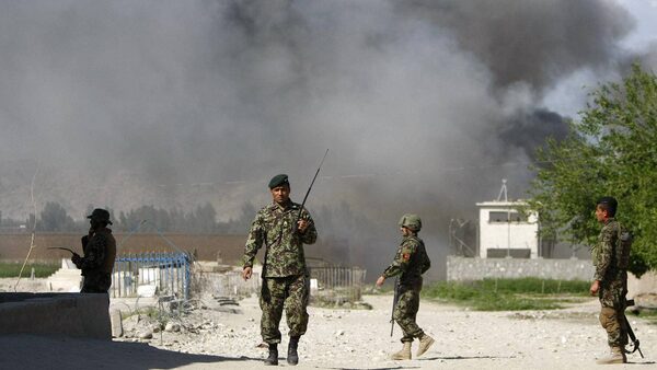 Soldiers from the Afghan National Army keep watch near the Provincial Reconstruction Team as smoke raise from the site of an attack in Jalalabad province April 15, 2012.Parwiz/Reuters