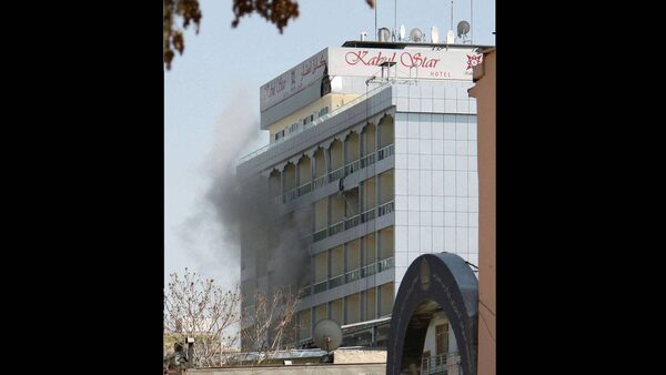 Smoke rises from a hotel after it was hit by a rocket-propelled grenade in Kabul, Afghanistan, Sunday, April 15, 2012.AP Photo/Kyodo News