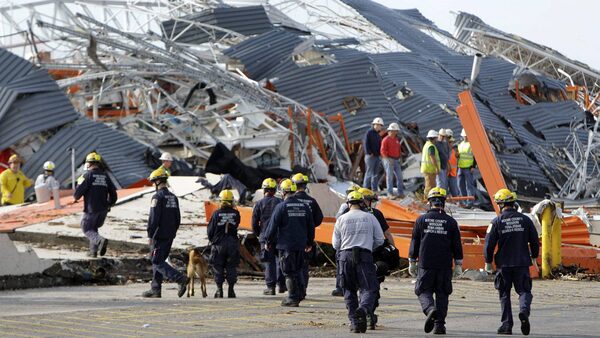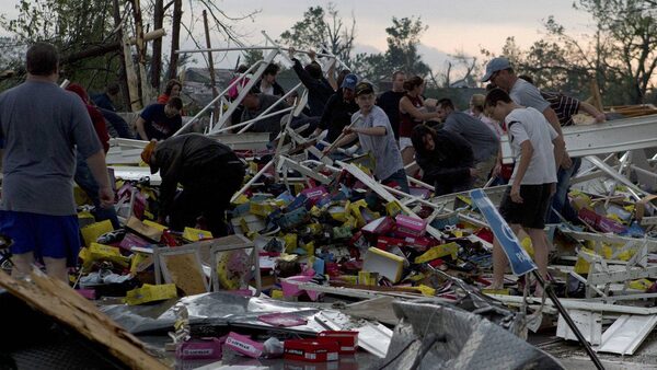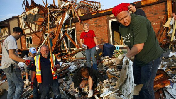 Volunteers look through the rubble for victims after a devastating tornado hit Joplin, Missouri, May 24, 2011. A monster tornado killed at least 116 people in Joplin, when it tore through the heart of the small Midwestern city, ripping the roof off a hospital and destroying thousands of homes and businesses.