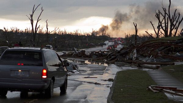 Smoke rises in the distance as vehicles drive along a road in Joplin, Missouri May 22, 2011 after a tornado hit the town.Reuters