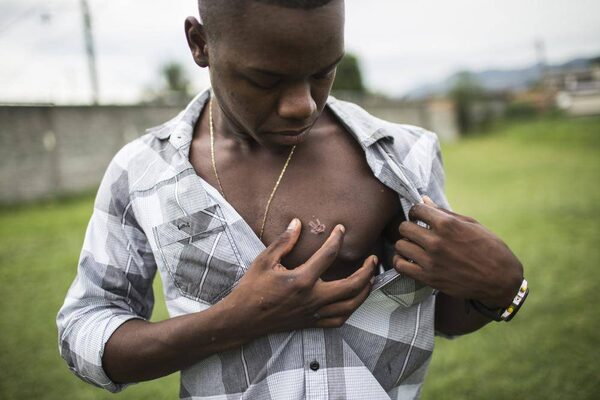 Chauan Jambre Cezario, 20, a church youth leader pictured here at his church, and his two friends were shot at by Rio's police when they were hanging out in a favela in Rio de Janeiro. One friend died, the other lived, and Chauan has a bullet lodged in the muscle near his heart.LIANNE MILTON