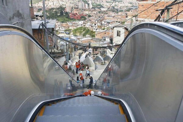 The centre is a couple of blocks from a station of the metro-cable, the cable car public transit system that Medellin pioneered to connect the hillside slums with the centre of the city, a design that has since been copied in Rio de Janeiro and Venezuela. The metro-cable connects with the metro system, and an expanding tram network, taking hours off commute times. In Comuna 13, which is today the city's most violent neighbourhood, there is a 384-metre-long escalator to whisk riders briskly to the top. All the comunas are sprinkled with parks and libraries, such as the airy glass-and-cement expanse of San Javier where elderly women received help with pension applications on a recent afternoon, and younger women gently transferred lettuce seedlings to a community garden.