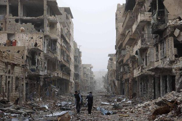 People inspect damaged areas in Deir al-Zor, Syria, on March 3, 2013.Reuters