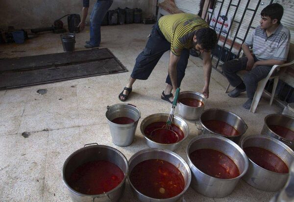 A member of the Free Syrian army arranges pots of food to be delivered to the Free Syrian army fighters fighting at the front line in Deir al-Zor on April 17, 2013.STRINGER/Reuters