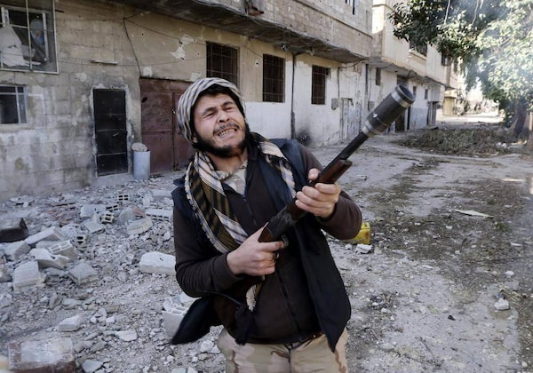 A fighter from the Free Syrian Army's Tahrir al Sham brigade uses a shotgun to fire an improvised grenade at Syrian Army soldiers in the Arabeen neighbourhood of Damascus in this Feb. 9, 2013 file photograph. Rebels have so far relied mainly on light weapons smuggled from neighbouring countries, many of them financed or sent from sympathisers in Gulf states, and from supplies seized from captured army bases inside Syria.Goran Tomasevic/Reuters