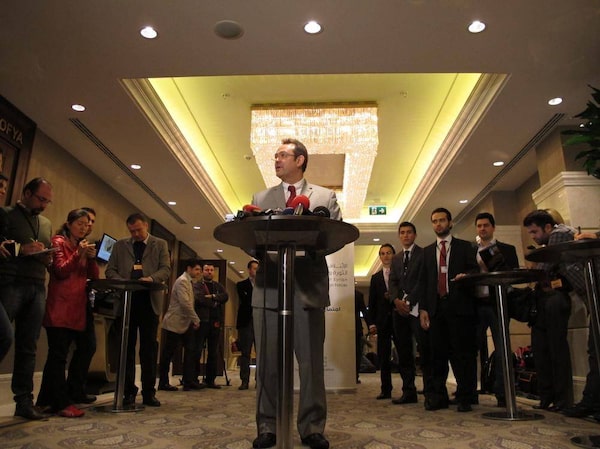 Khalid Saleh, the spokesman for the opposition Syrian National Coalition, speaks to reporters in Istanbul on Monday, March 18, 2013. The coalition began a push Monday to form an interim government to administer rebel-held parts of Syria.Ben Hubbard/The Associated Press
