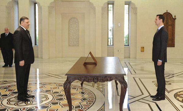 Riyad Hijab is sworn in as new Syrian Prime Minister by Syrian President Bashar al-Assad (R) in Damascus.SANA/Reuters
