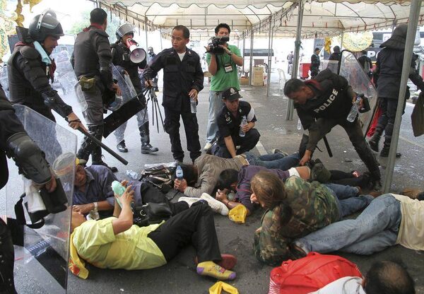 Police detain anti-government protesters after a scuffle near the government house in Bangkok November 24, 2012. Thousands of protesters gathered near parliament in capital Bangkok on Saturday, demanding the ouster of Prime Minister Yingluck Shinawatra.STRINGER/Reuters