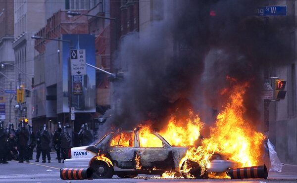 A police car burns after anti G20 summit protesters set fire to it in downtown Toronto.Frank Gunn