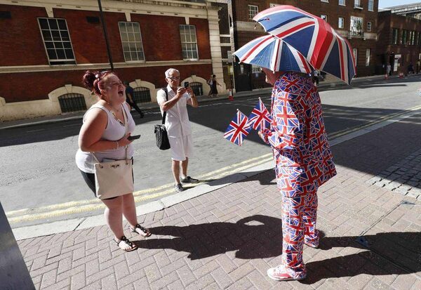 Not long after they left, five sisters from Durham, England, jumped out of a cab, put on their sunglasses and posed for pictures in front of the doorway. The sisters took off just as quickly and were followed by a woman who insisted on taking a picture of her two small dogs decked out in Union Jacks. The dogs dutifully posed for several minutes in the hot sun as media from around the world filmed them as if they were celebrities.