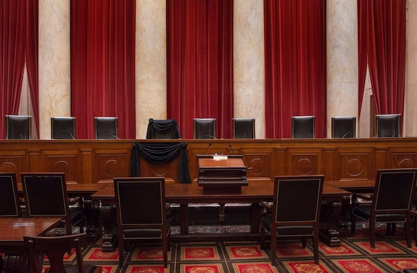 The courtroom of the U.S. Supreme Court, where former associate justice Antonin Scalia’s chair and the bench in front of his seat are draped in black following his death earlier this month.SUPREME COURT OF THE UNITED STATES/AFP / Getty Images