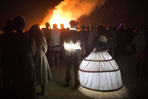 People in costumes watch as the wooden effigy burns during the 2015 Midburn festival in the Negev Desert.Menahem Kahana/AFP / Getty Images