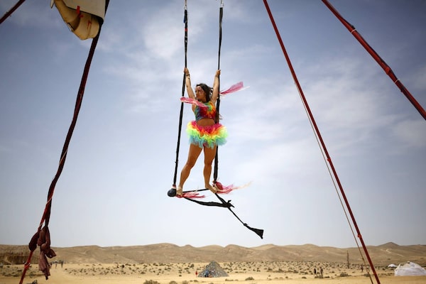 An Israeli woman swings in the air during the 2015 Midburn festival in the Negev Desert near the Israeli kibbutz of Sde Boke.Gali Tibbon/AFP / Getty Images