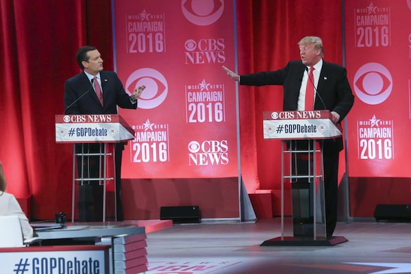 Sen. Ted Cruz of Texas and Donald Trump argue during the Republican debate hosted by CBS News in Greenville, S.C., Feb. 13, 2016.JIM WILSON/The New York Times