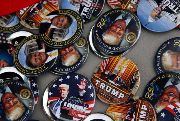 Buttons for sale for US Republican presidential candidate Donald Trump are seen outside his rally at the Summit Sports and Ice Complex on August 19, 2016 in Diamondale, Mich.JEFF KOWALSKY/AFP / Getty Images