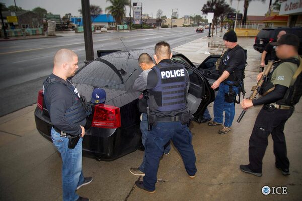 In an undated handout photo, Immigration and Customs Enforcement officers detain a suspect in Los Angeles in February of 2017. With an executive order last month and a pair of Department of Homeland Security memos on Feb. 22, the Trump administration has significantly hardened the country's policies regarding illegal immigration.U.S. Immigration and Customs Enforcement/The New York Times