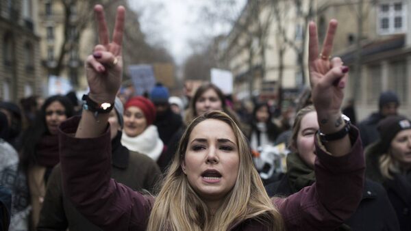 A demonstrator takes part in a protest against U.S. President Donald Trump's recent travel ban to the U.S. in Paris, Saturday, Feb. 4, 2017. People gathered to protest Trump's executive order temporarily banning immigrants from seven Muslim-majority countries from entering the U.S. and suspending the nation's refugee program.