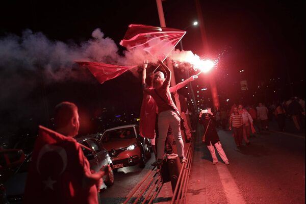 Pro-government supporters hold a flare as they protest on Istanbul's iconic Bosporus Bridge, late Thursday, July 21, 2016. Turkish lawmakers approved a three-month state of emergency, endorsing new powers for Turkey's President Recep Tayyip Erdogan that would allow him to expand a crackdown that has already included mass arrests and the closure of hundreds of schools, in the wake of the July 15 failed coup.Petros Giannakouris/The Associated Press