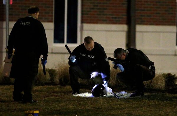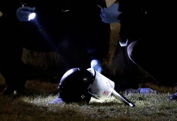 Police shine a light on a helmet as they investigate the scene where two police officers were shot outside the Ferguson Police Department.Jeff Roberson/The Associated Press