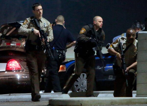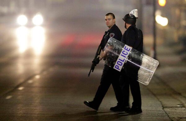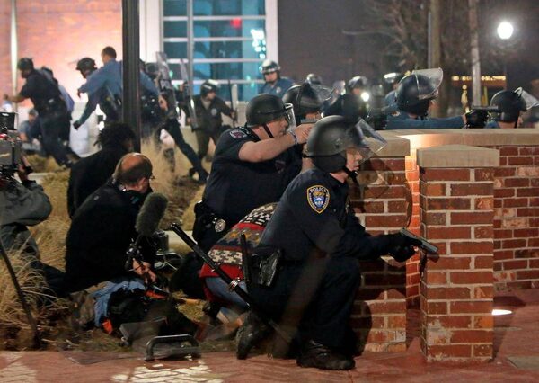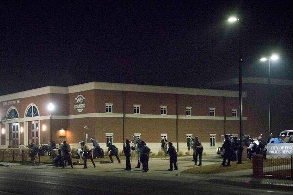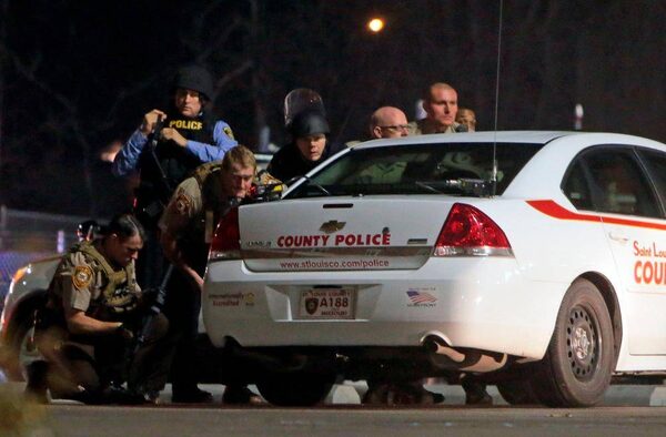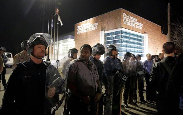 Police stand guard moments after gun shots were fired outside the City of Ferguson Police Department and Municipal Court in Ferguson, Missouri.Kate Munsch/Reuters