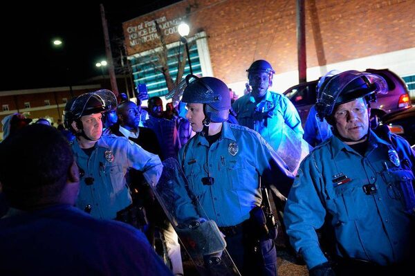 Police in riot gear respond to demonstrators blocking traffic during a protest outside the Ferguson Police Department on Wednesday March 11.Michael B. Thomas/Getty Images