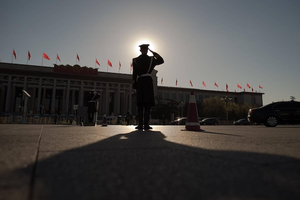 A paramilitary police officer salutes at a security check point as a car with officials drive past ahead of the CPPCC Closing ceremony at the Great Hall of the People in Beijing on March 13, 2017.NICOLAS ASFOURI/AFP / Getty Images