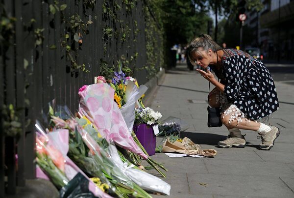 A woman places flowers and a written message beside other floral tributes near the site of a mass stabbing that killed one person, on Aug. 5, 2016.DANIEL LEAL-OLIVAS/AFP / Getty Images