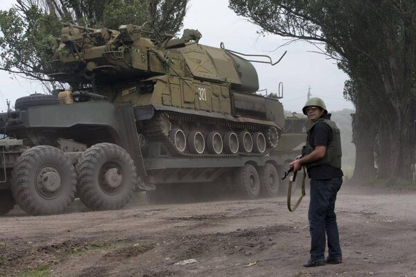 Ukrainian government forces maneuver antiaircraft missile launchers as they are transported north-west from Slovyansk, eastern Ukraine Friday, July 4, 2014.Dmitry Lovetsky/The Associated Press