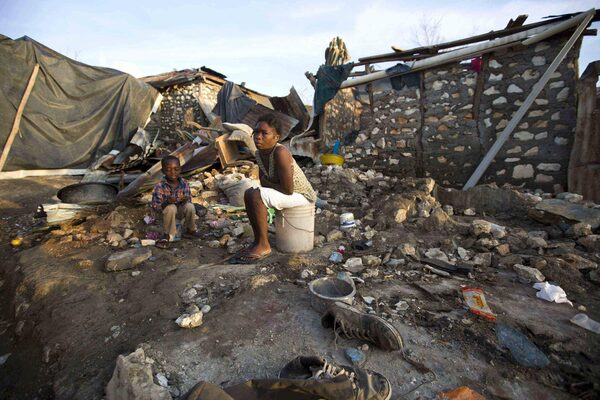 A woman and a child sit amid the ruins of their home destroyed by Hurricane Matthew, in Jeremie, Haiti, Monday, Oct. 10, 2016. Almost a week after Matthew's assault, power is still out and water and food are scarce.Dieu Nalio Chery/The Associated Press