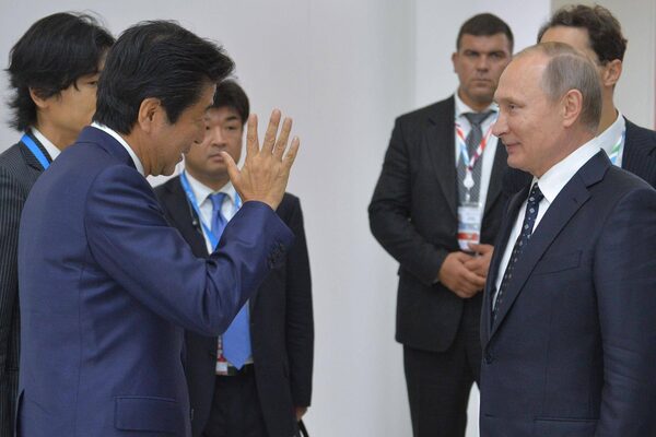 Japanese Prime Minister Shinzo Abe speaks with Russian President Vladimir Putin during the Eastern Economic Forum in Vladivostok, Russia, on Sept. 3.ALEXEI DRUZHININ/AFP / Getty Images