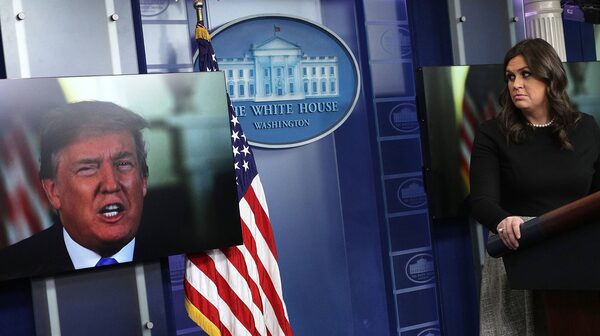 U.S. President Donald Trump speaks via a video as White House Press Secretary Sarah Sanders listens during a daily news briefing at the James Brady Press Briefing Room of the White House, in Washington, D.C., on Jan. 4, 2018. Sanders spoke on various topics including the new book "Fire and Fury", written by Michael Wolff.Photo by Alex Wong