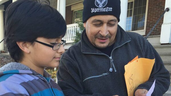Under a cloudless sky on a perfect fall day, Edison Hernandez bounds up the stairs of yet another house and turns to his 12-year old son Brian.
