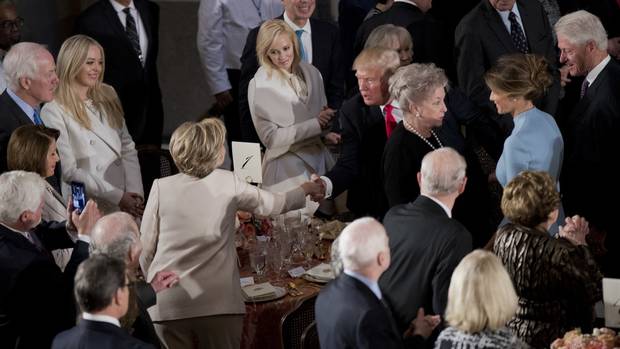 Newly sworn in President Donald Trump shakes hands with Hillary Clinton at the inaugural luncheon at the Statuary Hall in the Capitol, Friday, Jan. 20, 2017, in Washington.