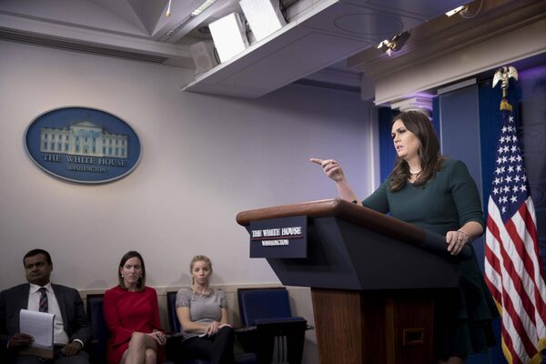 Press Secretary Sarah Huckabee Sanders holds a daily briefing, at the White House in Washington, Oct. 20, 2017. A series of political attacks between Rep. Frederica Wilson (D-Fla.) and the White House continued on Friday.TOM BRENNER/The New York Times