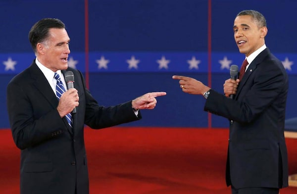 Republican presidential nominee Mitt Romney and U.S. President Barack Obama trade barbs during the second debate.MIKE SEGAR/Reuters