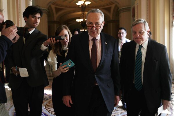 U.S. Senate Minority Leader Sen. Chuck Schumer (D-NY) (2nd R) speaks to members of the media as he walks with Senate Minority Whip Sen. Dick Durbin (D-IL) (R) at the Capitol Dec. 1, 2017 in Washington, D.C.Alex Wong/The Globe and Mail