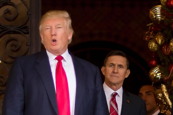 This Dec. 21, 2016, file photo shows Donald Trump with with Michael Flynn at Mar-a-Lago in Palm Beach, Fla.JIM WATSON/AFP / Getty Images
