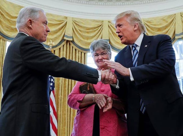 President Donald Trump shakes hands with Attorney General Jeff Sessions, accompanied by his wife Mary, after he was sworn-in by Vice President Mike Pence, Thursday, Feb. 9, 2017, in the Oval Office of the White House in Washington. (AP Photo/Pablo Martinez Monsivais)The Associated Press