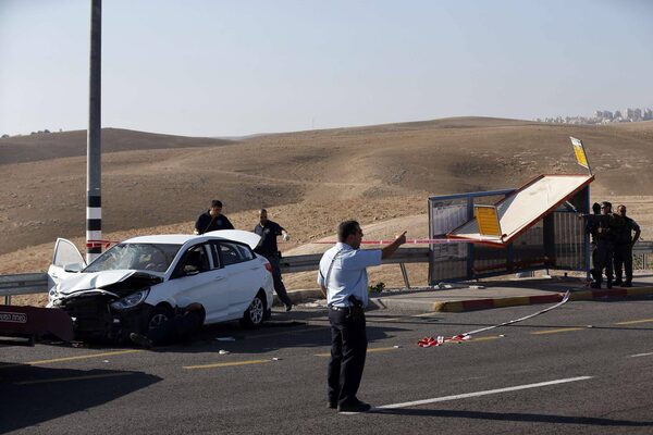 Israeli security forces stand at the site where a Palestinian man rammed his car into Israelis soldiers standing by a bus station on a highway next the Jewish settlement of Kfar Adumim in the occupied West Bank on Nov. 27, 2015.AHMAD GHARABLI/AFP / Getty Images