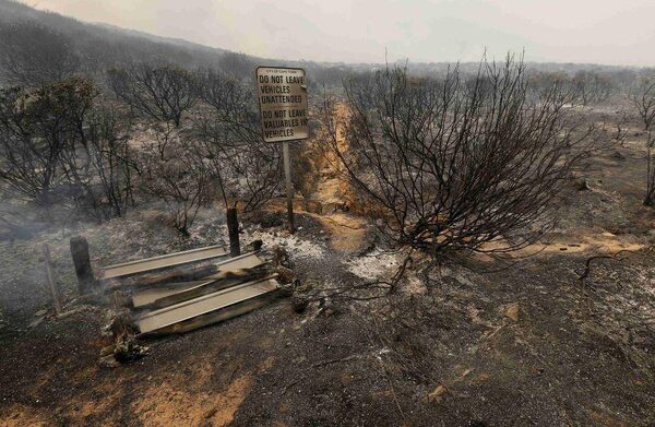 Burnt out signs sit among smouldering remains after fire swept along Cape Town's scenic Chapman's Peak Drive.Mike Hutchings/Reuters